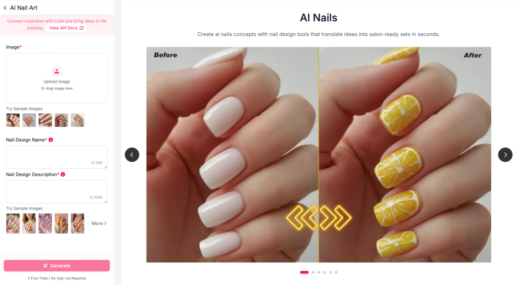 If you’re building a nail app or salon workflow, the page also links an AI Nails API entry point (“View API Docs”).