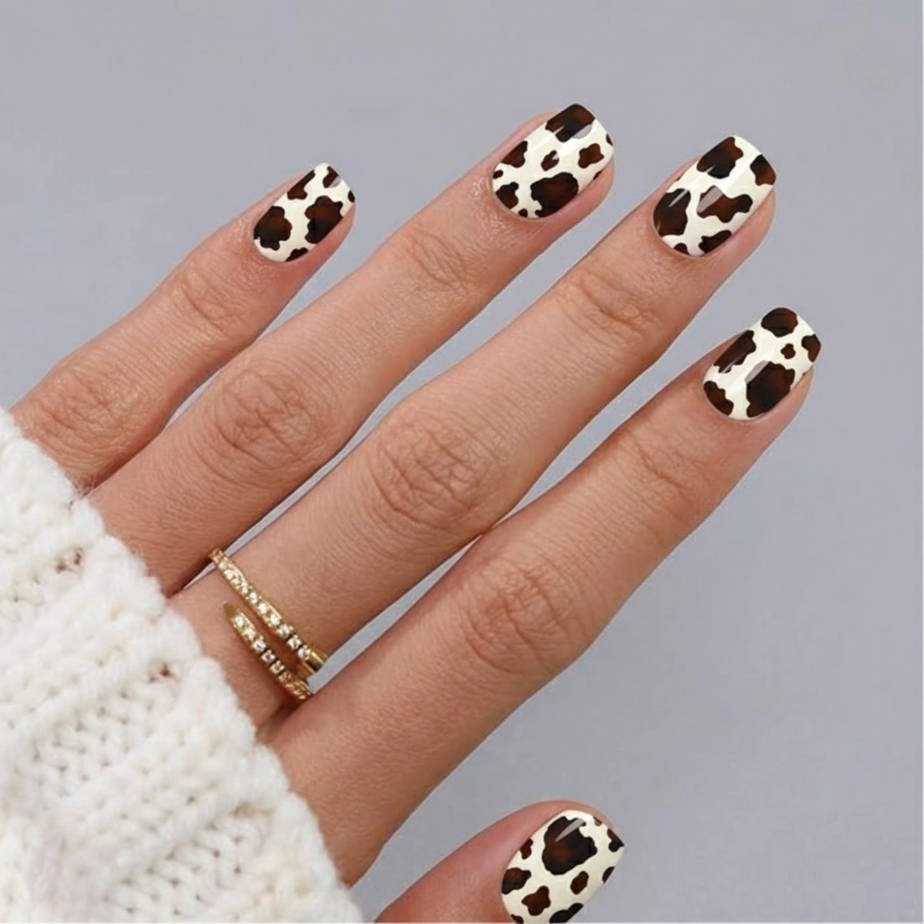 ![]() | "Cow Print Nails-Short squoval nails with a glossy cream/ivory base. Features an all-over cow print pattern made of irregular organic blobs in chocolate brown and deep espresso/black accents, with slightly softened edges for a natural hide-like look. High-contrast, minimal, and trendy." | ![]() |