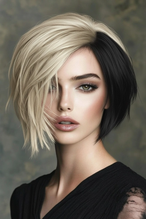 ![]() | name: AI Hair Color Blonde Black Split Dyedesc: Apply strict split-dye hair: one half creamy platinum-beige (#D8C8A8), the other half true jet black (#080808). Keep a crisp center split and clear two-tone contrast with realistic shine. | ![]() |